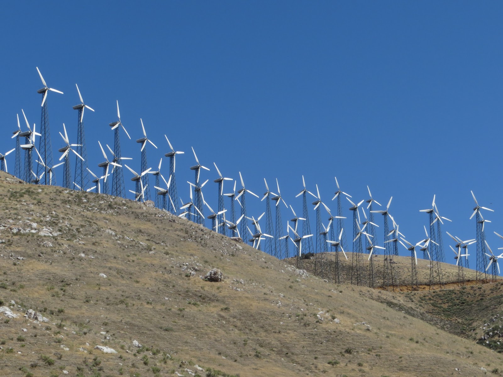 Just as we were thinking how unlucky we were to catch such strong winds crossing such hilly roads we started seeing wind turbines on top of the mountains, a sign that this was not a bad day but simply a typical day. First we saw dozens, then hundreds of turbines. Every hill had several, all lines up towards West and all spinning very fast.